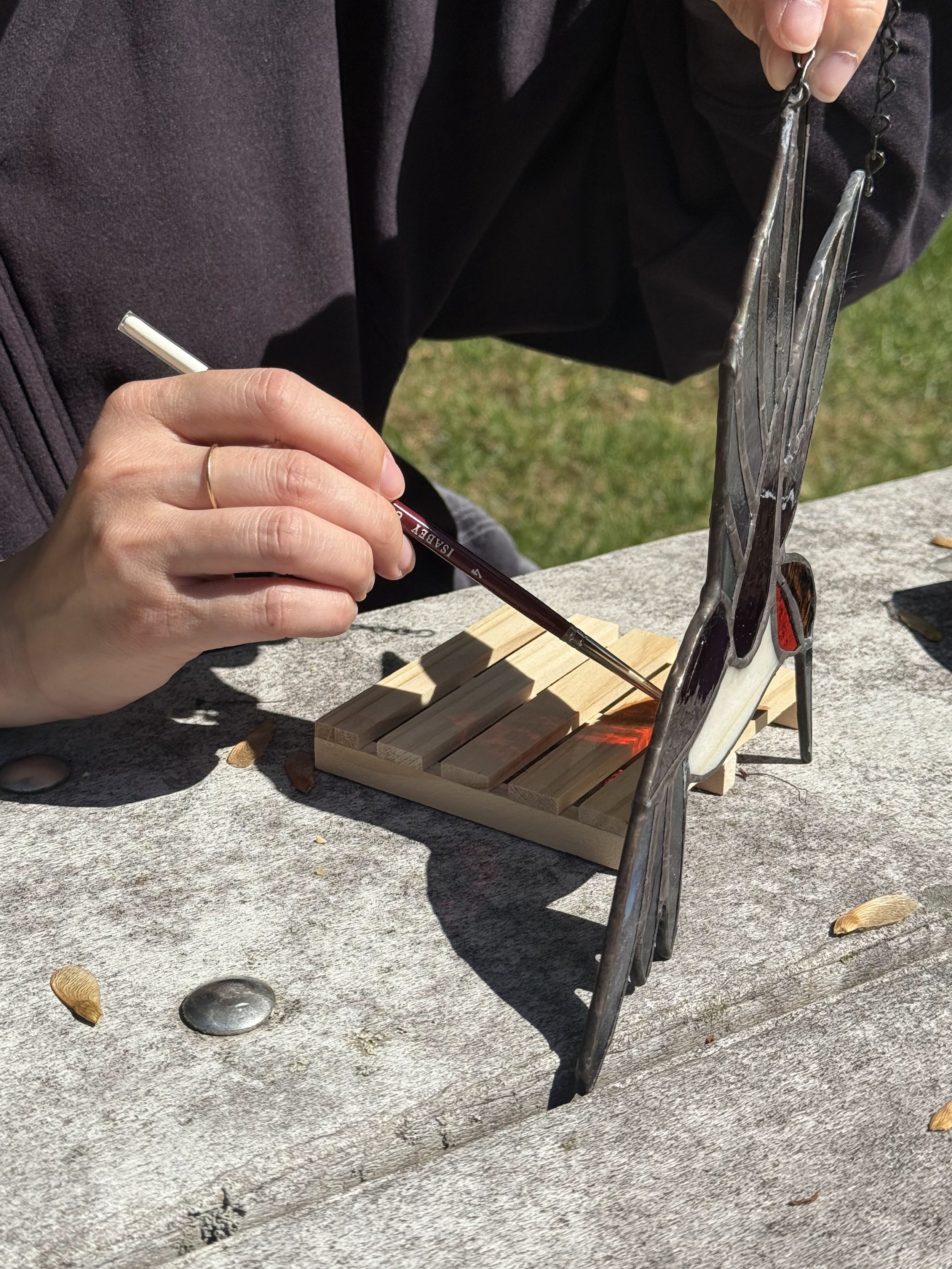 Her stained glass tent embodied this in betweenness. On a wooden pallet she traced the shifting colors, painting the red of a bird at the moment of flight. She inscribed three letters on the hidden side of the wood, the initials of her family, tucked away until the pallet was turned. “When we flip the glass, what was invisible becomes visible.” Inside and outside, concealment and revelation, both contained in a single gesture.