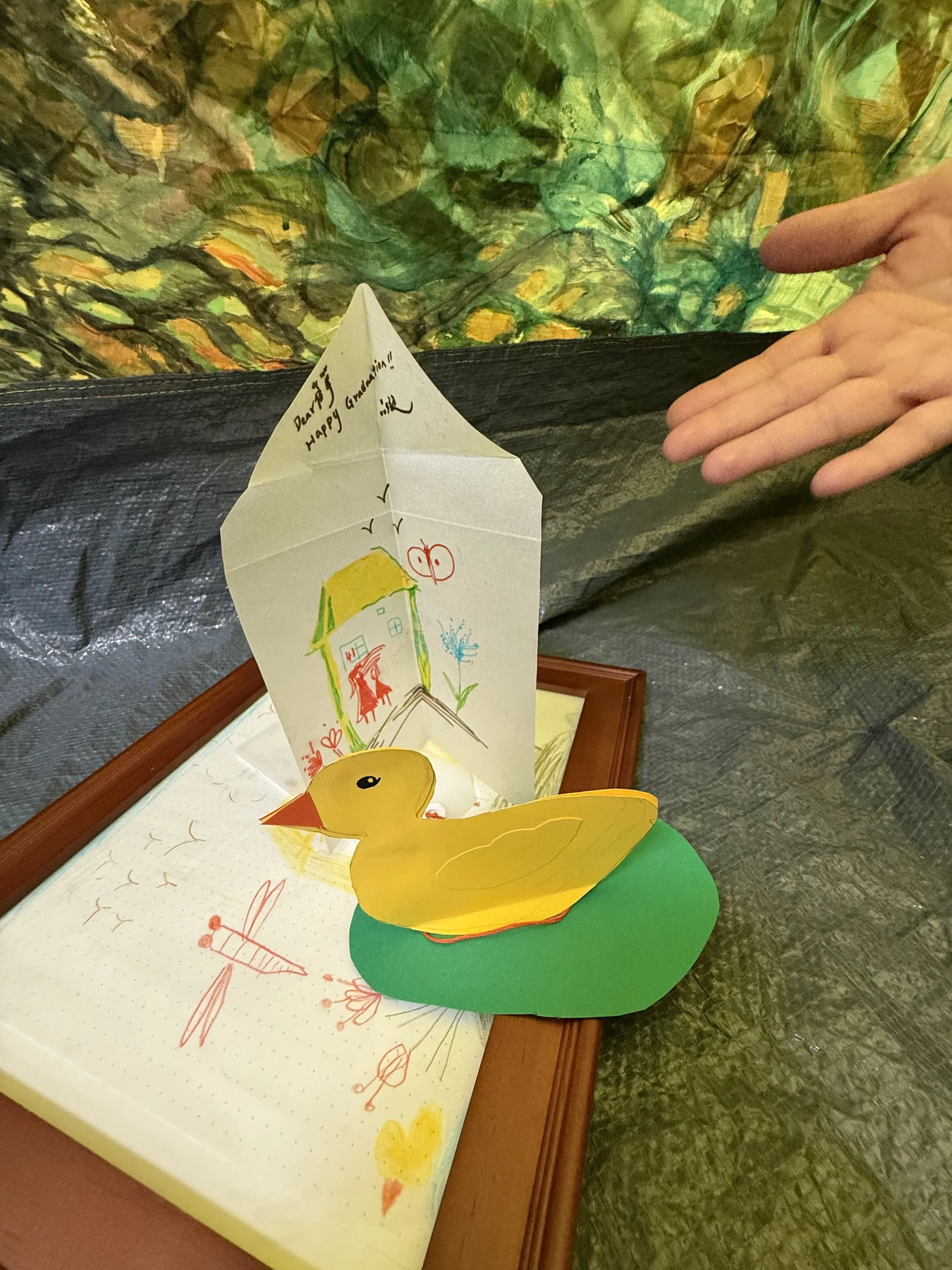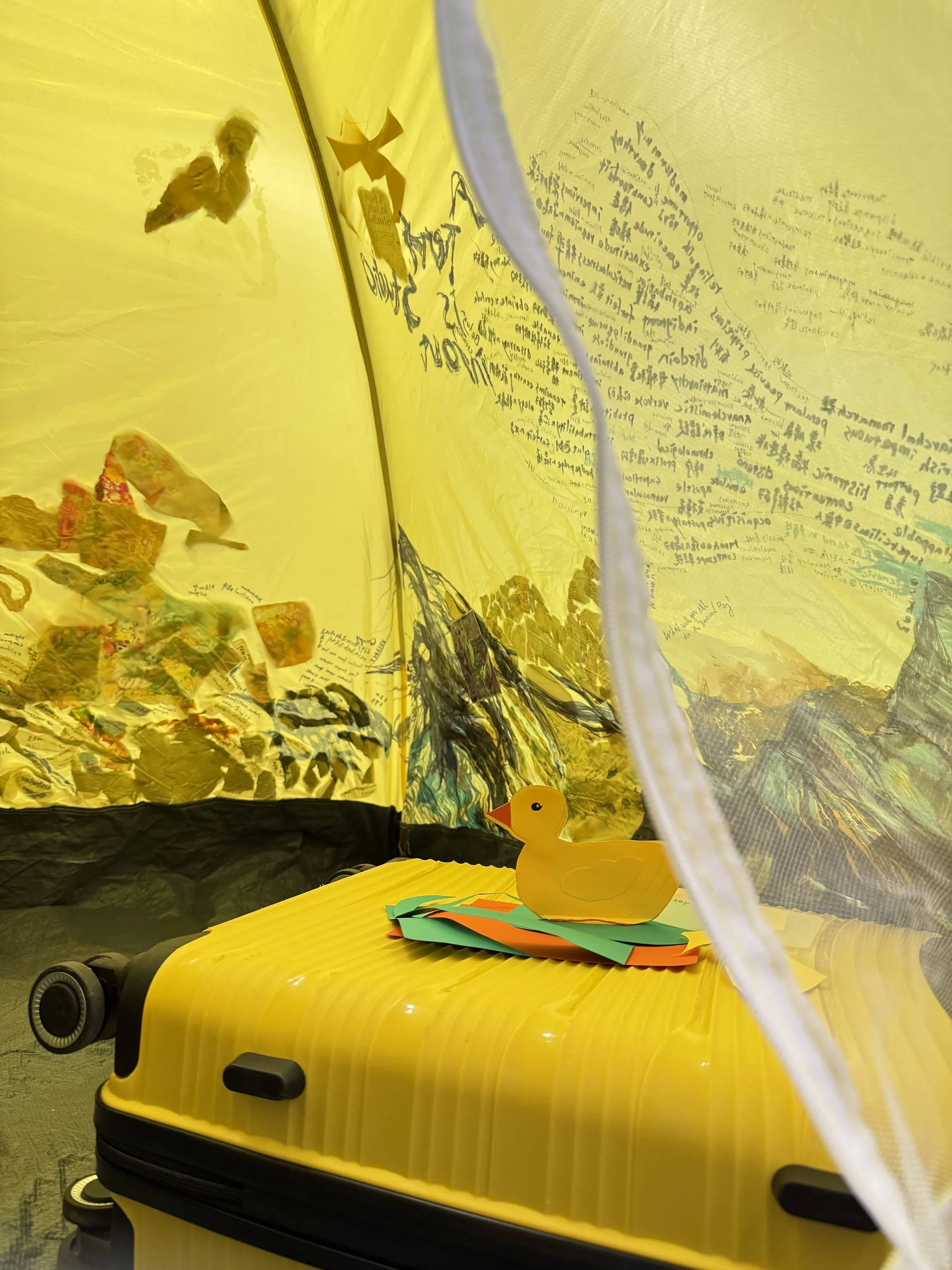 In a university classroom, Ki closed the yellow tent carrying transition. She traced and cut the outline of a duck from her daughter’s drawing, shaping paper into a fragile yet steadfast tent. Folding, erasing, and redrawing, she built a shelter of memory and resilience. Within its bright body she placed an amulet that whispered a quiet vow of survival: keep quacking, keep going, keep heard.