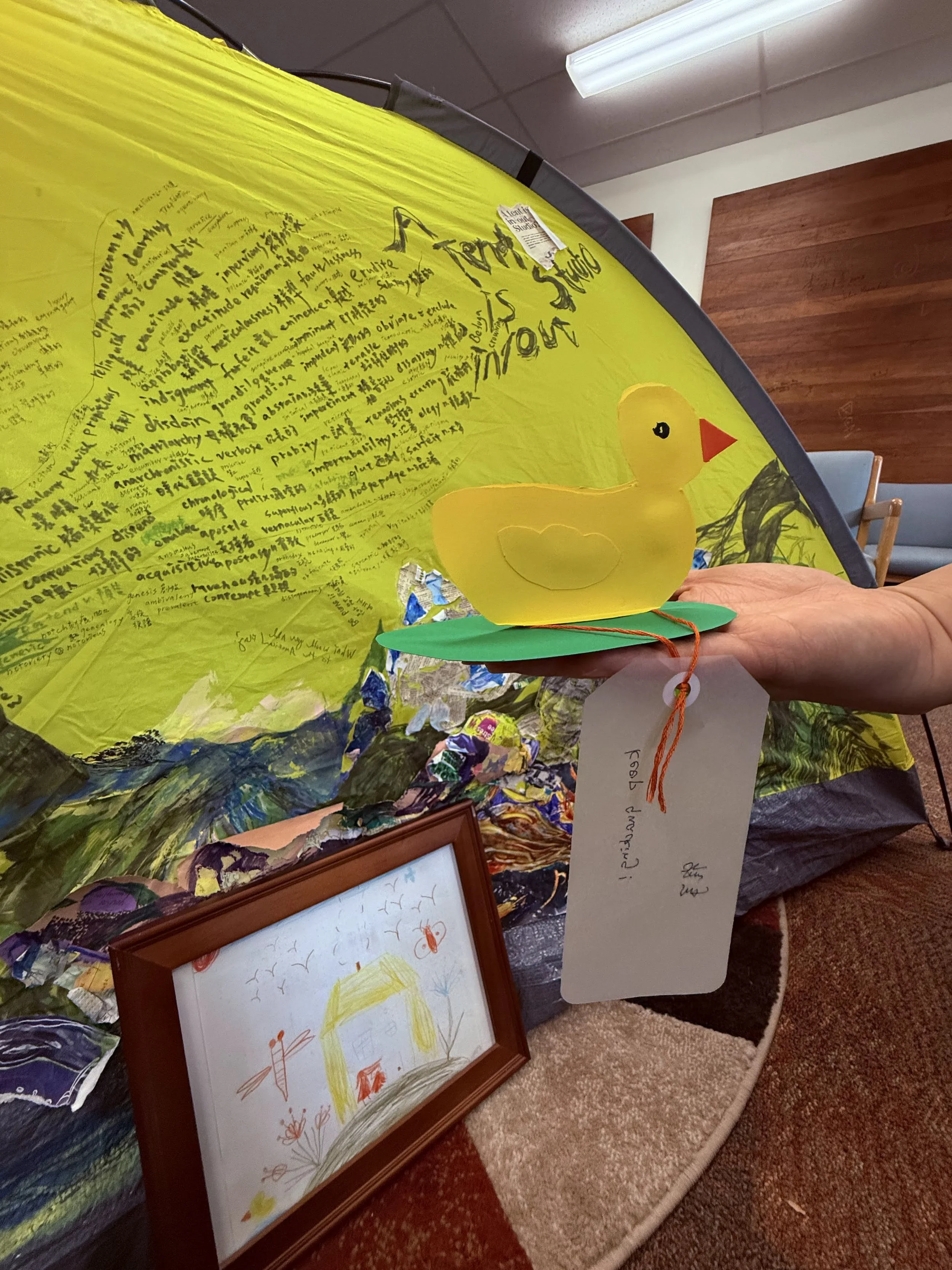 The duck tent glowed gently beside/outside/inside the larger yellow tent. Its paper body carried more than craft. It carried her daughter’s drawings, her own memories of bias and struggle, her daily exhaustion, her hope. The amulet whispered softly: keep quacking. To quack is to speak, sometimes faintly, sometimes insistently, but always to declare something.